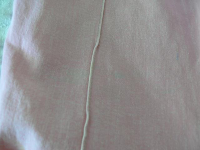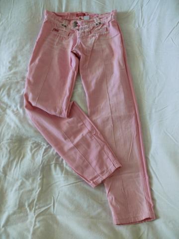 Rausvi karinti džinsai su kantu. Ant vienos klešnės yra išbaltėjimas (antroje nuotraukoje matosi).