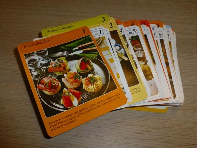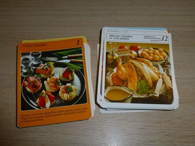 Įvairių receptų kortelės-apie 170vnt. Kortelės išdėliotos pagal grupes. Išmatavimai-10,5*11,5cm. Yra keli skirtukai. Receptų yra pačių įvairiausių. Kortelių būklė puiki.