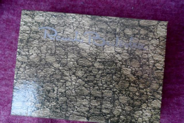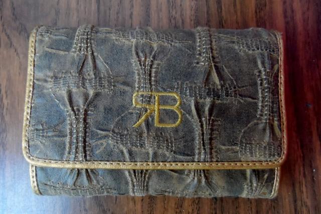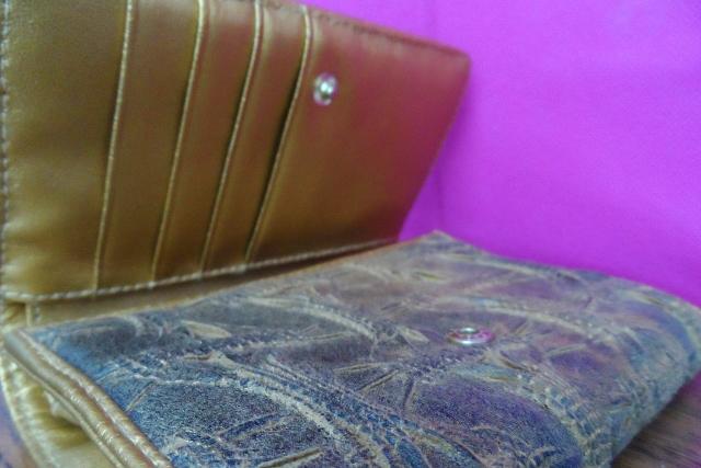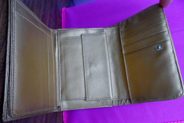 Dirbtinio pluošto, aukso spalvos piniginė. Gavau dovanų, tačiau nenaudojau. Daugybė skyrių kortelėms ir vizitinėms, vidus aukso spalvos, blizgus.