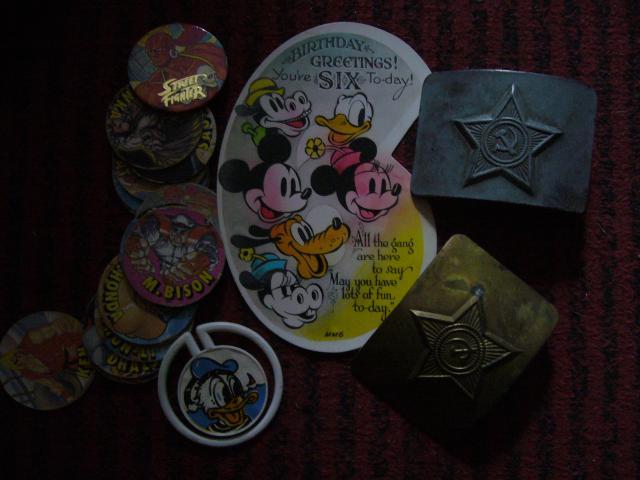 miki mauso atvirukas,yra ir tarybinis komiksas su juo. Street Fighter kiapsai, Donald Dacko tarybinis zenkliukas, NBA kiapsai, 200 popiergaliu is filumenijos, sagtys(ta pilka sake labai reta).
