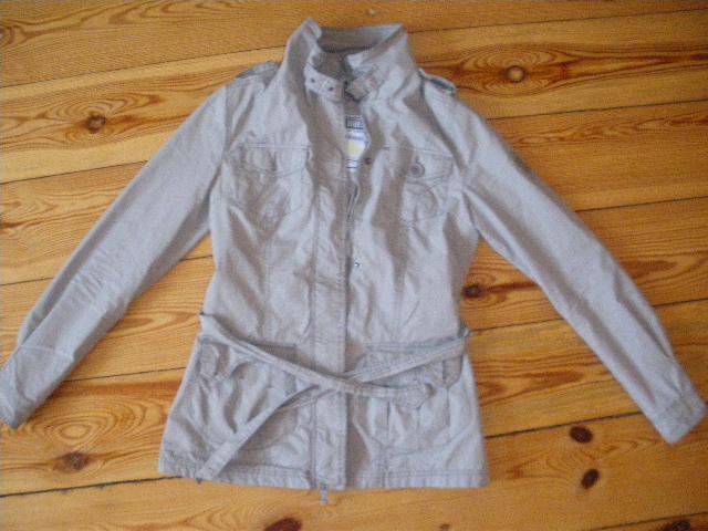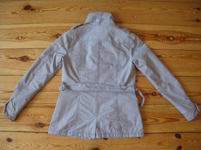 Pilkos spalvos, sportinio stiliaus lietpaltukas, truputi įliemenuotas. Su defektu prie kišenės.