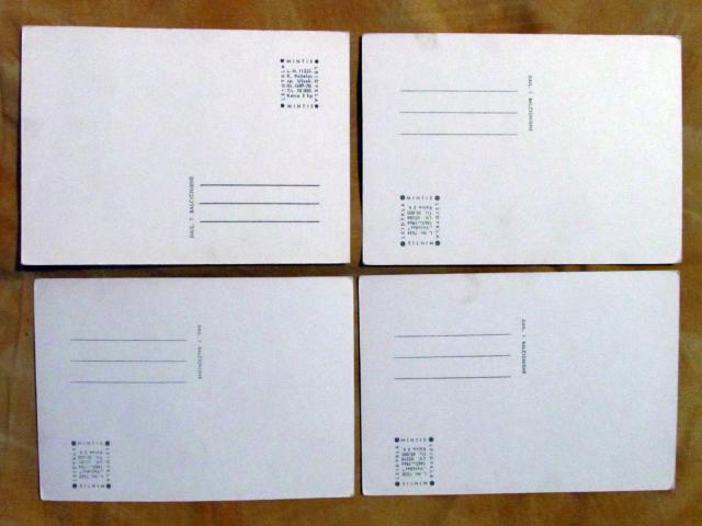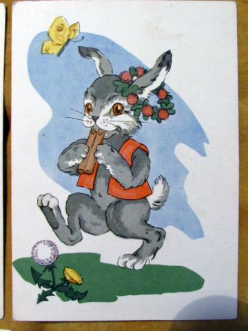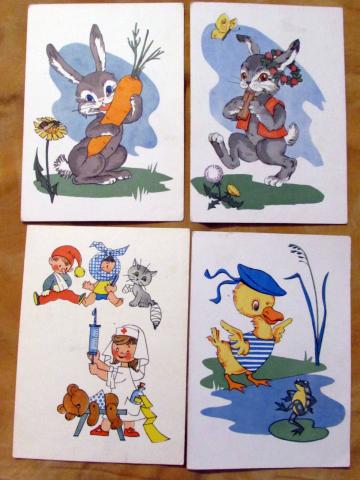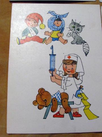 Vieno atviruko kaina - 1 eu. Dailininkė - T. Balčiūnienė. Ligoninė - kačiukas, buratinas, meškis, švirkštas. Zuikis su morka, pienė, bitė. Ančiukas, varlė, bala. Drugelis, zuikis, skudutis (skudučiai), vainikėlis.