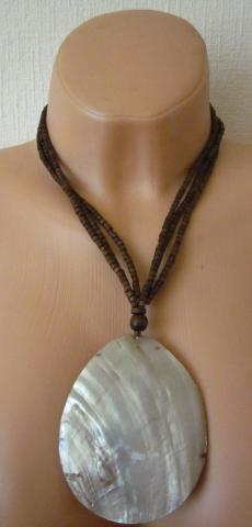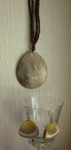 Rinkinys - auskarai ir kaklo papuošalas. Iš tikrų kriauklių. Prieš atiduodama pakeisiu auskarų kabliukus į naujus. Kaklo papuošalo pakabuko išmatavimai 9x7 cm, auskarų 3,5x3,5 cm. Kaklo papuošalo ilgis reguliuojasi ties užsegimu (26-34 cm).