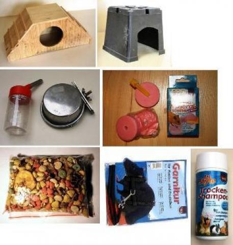 medinis namelis, namukas darytas iš vazono, maža gertuvė, metalinis dubenėlis kuris prisisuka prie narvelio kad neišsiverstų, pusė didelio maišo maisto su skanėstais riešutais ir bananais, pavadėlis mėlynas, keturi skritulėliai druskos ir...