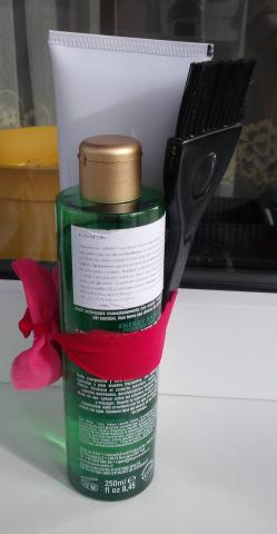 Į rinkinį įeina: Šampūnas sausiems plaukams (kartą naudotas) Plaukų kaukė. Sausiems plaukams. 300ml., taciau pora kartu naudota, like apie 250ml. Kainavo 50lt. Šluotelė plaukų dažymui (kartą naudota) Šluotelė plaukų dažymui su šukomis ir vąšeliu ( kartą naudota)