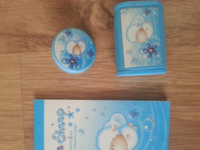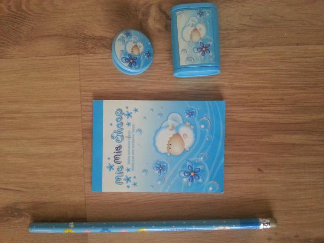 Rinkinį sudaro paprastas pieštukas, užrašų knygutė, drožtukas, segtukas popieriaus lapams. Visi daiktai puošti avyte.