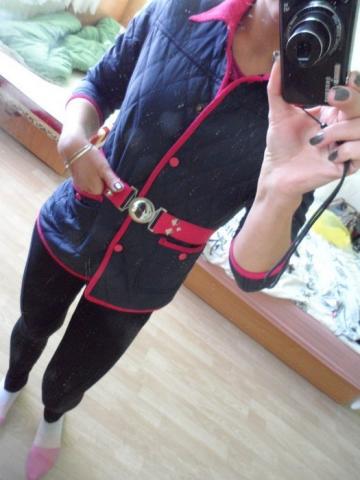 modelio dydis 34 (158cm 47kg) tinka, tik rankoves labai trumpos. galima su riesinemis pazaisti tada tiks ir mazosioms moterytems. defektai tik kad truksta dvieju roziniu knopkiu (isores, viduje viskas yra), jas galima is kiseniu isimti. rankogaliai atsilenkia, yra roziniai dryzuoti.