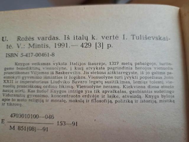 1991m. Umberto Eko, nugarėlė paklijuota, vidus tvarkingas
