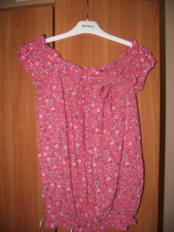 Gėlėta, pūsta, apačioje ir prie krūtinės sutraukta su guma, kurios nesijaučia, Viršuje, šone galima iš tokios pat medžiagos surišti kaspinėlį, puikiai atrodo su aukšto liemens rūbais. Dydis s/m
