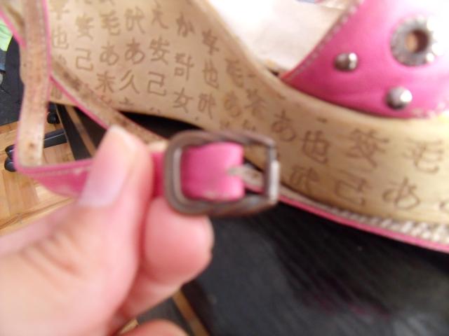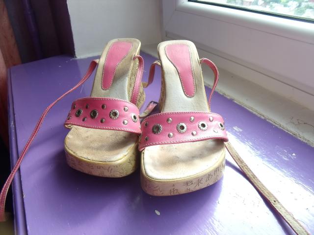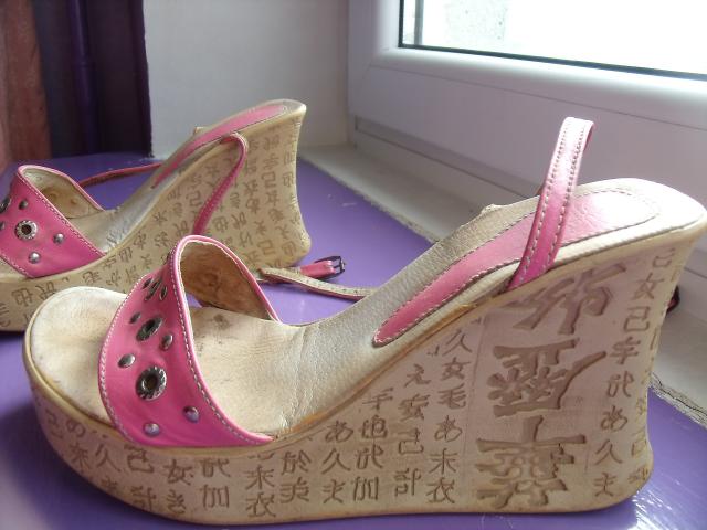 Ruzavos spalvos. Padas 3cm, platforma 9cm. Liena firma. Per visa platforma eina isgravineti kinieciu zenklai. Vienas defektas, sagtis vienos basutes suluzus, bet galima pigiai pakeist