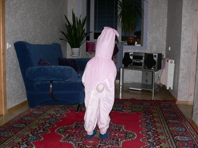 Visiškai naujas rožinio kiškio kostiumėlis 3 metų vaikui. Kepurė su akimis, ūsais ir ausim (nuotraukoje snukučio nesimato).