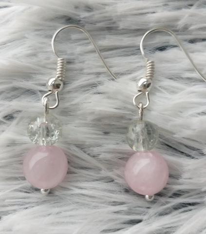 Nauji, nenešioti, rankų darbo rožinio kvarco 8 mm ir daužto stiklo pusbrangakmenių karoliukų auskarai. Gali būti perkama, kaip komplektas kartu su apyranke. Rožinis kvarcas - tai meilės, švelnumo ir vidinės ramybės akmuo. Jis žmogų veikia nepaprastai švelniai ir atpalaiduojančiai. Su apyranke sudaro komplektą.