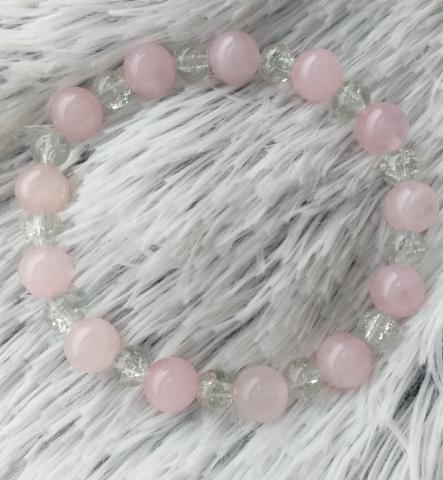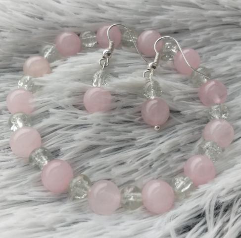 Nauja, nenešiota, rankų darbo rožinio kvarco 8 mm ir daužyto stiklo (kalnų krištolo) apyrankė. Rožinis kvarcas - tai meilės, švelnumo ir vidinės ramybės akmuo. Jis žmogų veikia nepaprastai švelniai ir atpalaiduojančiai. Apyrankė gali būti nešiojama kartu su auskarais.