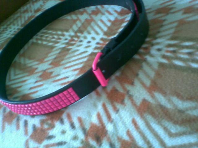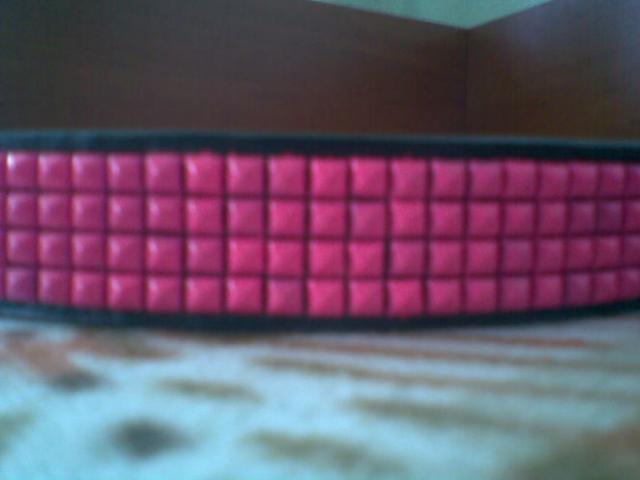Rožinis diržas iš mažų kniedžių.