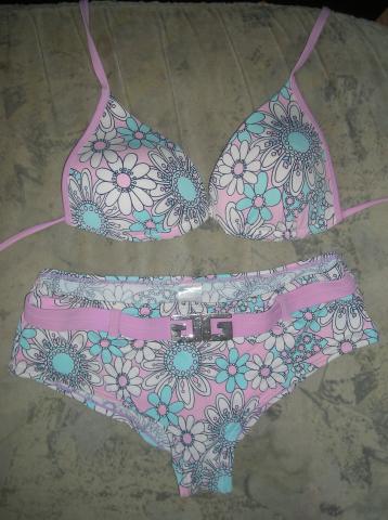 3 kartus dėvėtas rožiniai margas, gėlėtas maudymukas. Liemenėlė su pakietinimais, susirišra ant kaklo ir nugaroje. Kelnaitės su dirželiu ir metaliukais. Dydis UK 36 rašo.