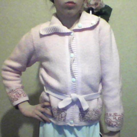 rozinis megstukas yra dirzas aplink juosmeni tamsiai roziniai ornamentai megztinio apacioje.tiktu nuo 8 iki 10 metu kaina 6Lt