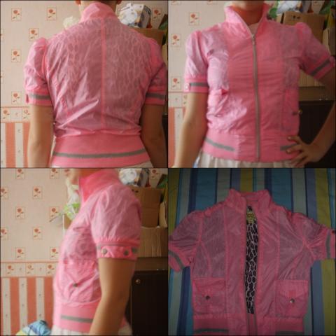 Rožinis švarkelis trumpomis rankovėmis. Tinka s/m dydžiams. Užsidėtas tik vieną kartą, todėl būklė jo puiki. Vidinė pusė su raštuku, kuris persišviečia ir į išorinę pusę.
