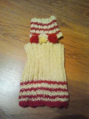 Geltonas su raudonu suniuko rubelis. Maniskis suniukas labai greit uzaugo, tai kelis kartus tebuvo uzsidejes.