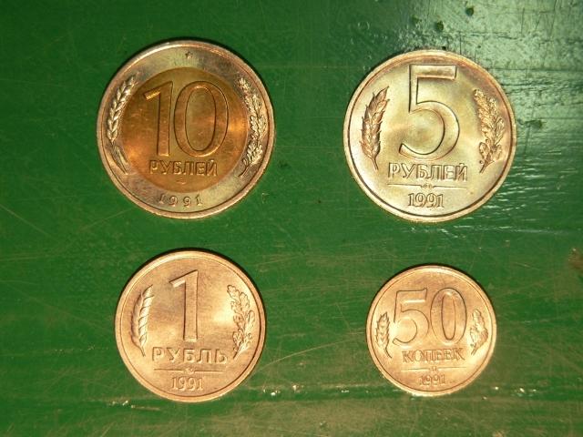 1991m. rubliai ir kapeikos 10rub. po 10vient. 5rub. po 10vient. 1rub. po 10vient. 50kop. po 10 vient.