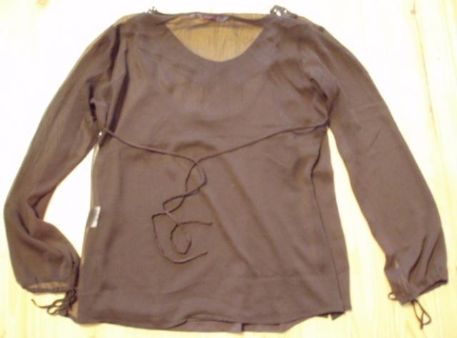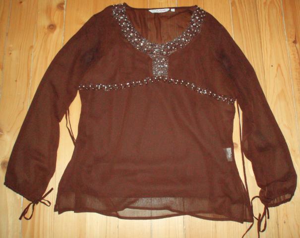 Dviejų sluoksnių mažai dėvėta ruda, karoliukais siuvinėta bliuzelė nėščiajai. Apačioje - ruda maikutė ant petnešėlių, kurių ilgis reguliuojamas. Rankovių apačia - su raištukais. Viršutinis bliuzelės sluoksnis po krūtine nugaroje surišamas raišteliais. 100 proc. polyseteris.