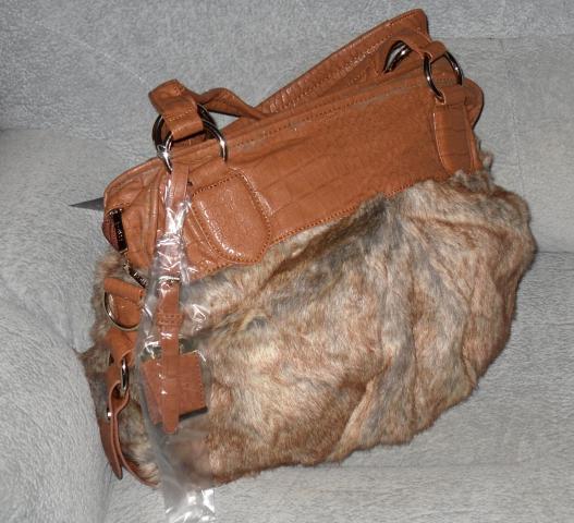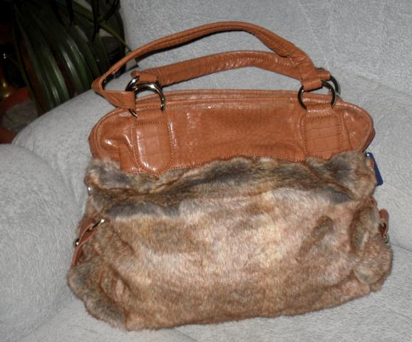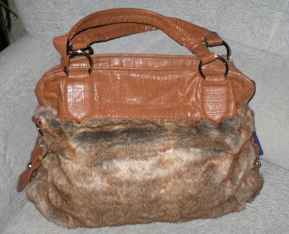 Ruda rankinė su kailiuku, puikiai tiks žiemos sezonui. Dugno plotis ~ 7cm, ilgis ~ 32,5cm, ausktis ~ 34cm, ausktis su rankenom ~ 54cm.