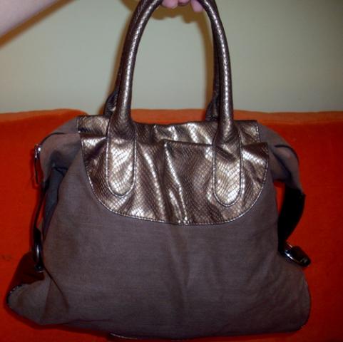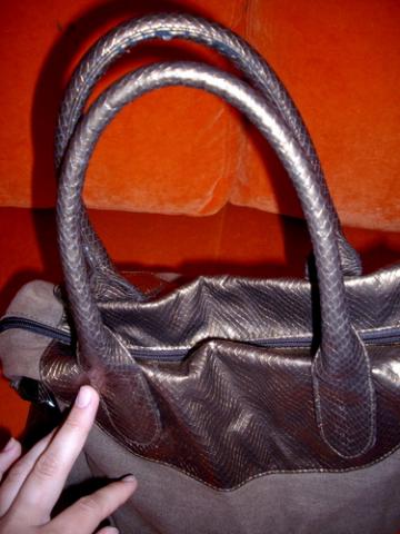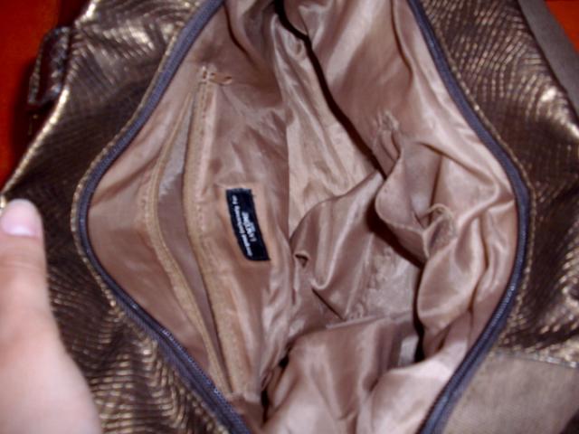 Tamsiai ruda rankine.Yra kai kur pasitryne kampuciai,bet tai nesioti netrukdo,nes nelabai matosi.Vidus svarus be jokiu defektu.