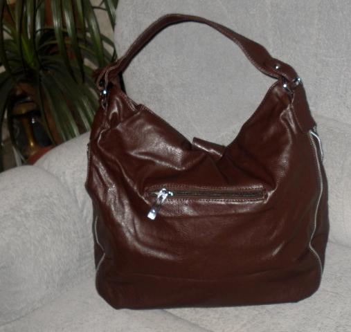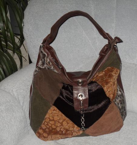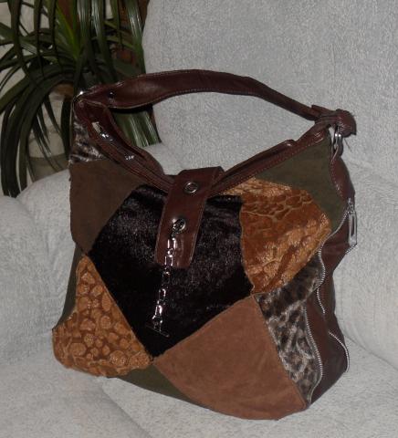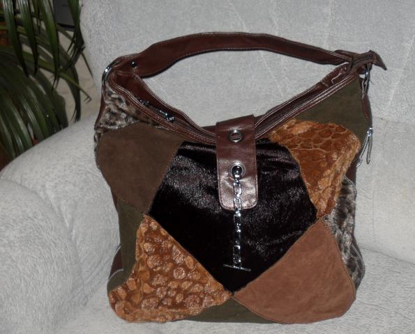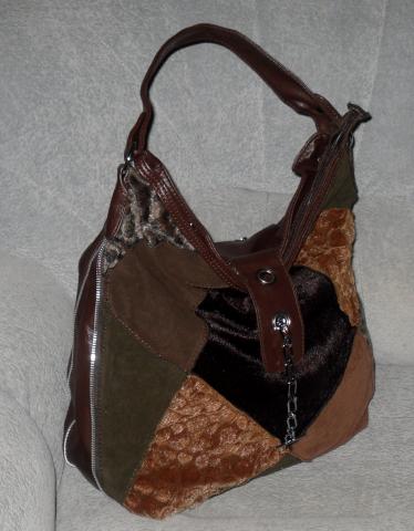 Ruda rankinė su spalvotais kailiukais. Dugno plotis ~ 10,5cm, ilgis ~ 37cm, ausktis ~ 40cm, ausktis su rankenom ~ 58cm