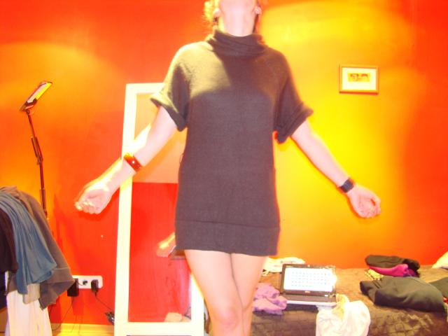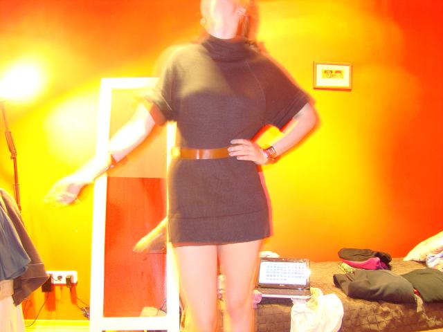 Tamsiai rudos spalvos plono mezgimo suknele. Siek tiek panesiota, bet tikrai nenunesiota. prie jos yra dirzelis, bet as isidedavau savo,o dazniausiai is vis be jo nesiodavau, rankoves platokos. kaklas aukstas. Labai tinka su ilgomis virs keliu megtomis pedkelnemis.