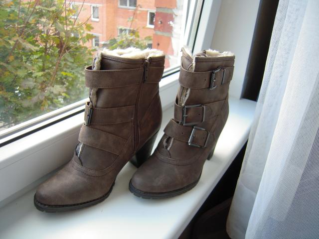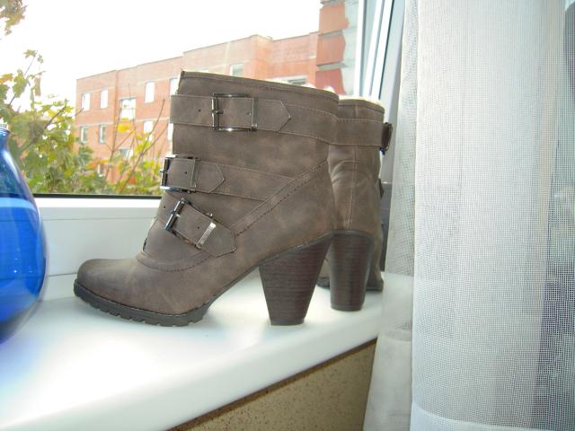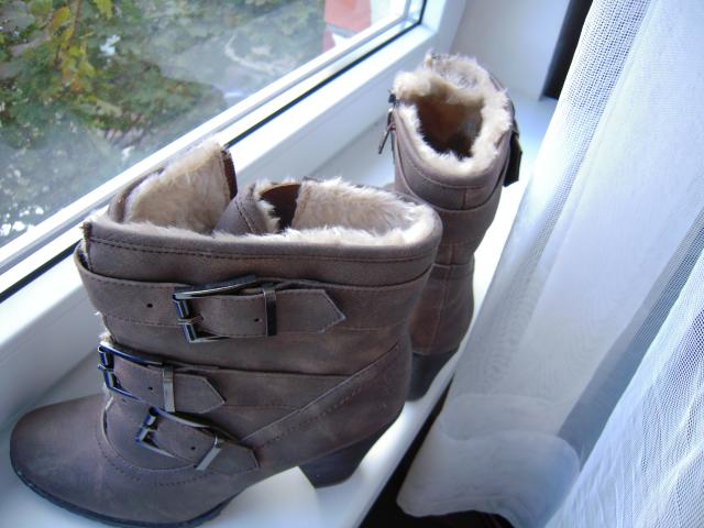 Pilkšvai rudi batai rudeniui, su šviesiu kailiuku, papuošti sagtimis, patogus minkštas kulnas, užapvalinta nosytė, nė kartą nedėvėti. Dydis 40.