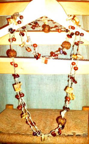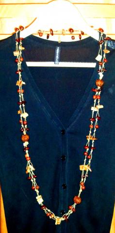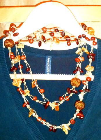Rudi karoliai, rankų darbo. Padaryti iš medvilninės virvelės, karoliukų ir medienos.