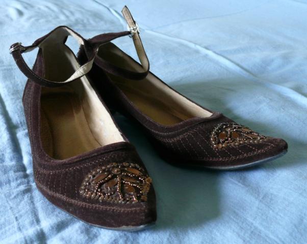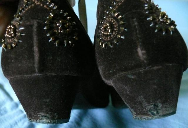 Susegami dirželiu per čiurną. Zomšiniams kulneliams reikia remonto (matosi nuotraukoje).