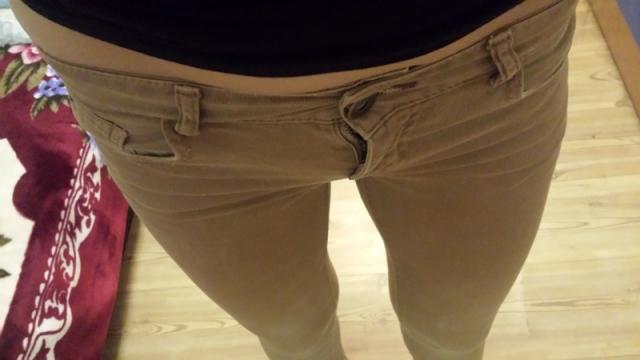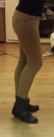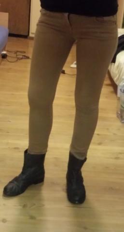 Geros būklės, rudos spalvos siaurėjančios kelnės, keliukai vos vos yra padilę, bet atrodo tikrai gerai.