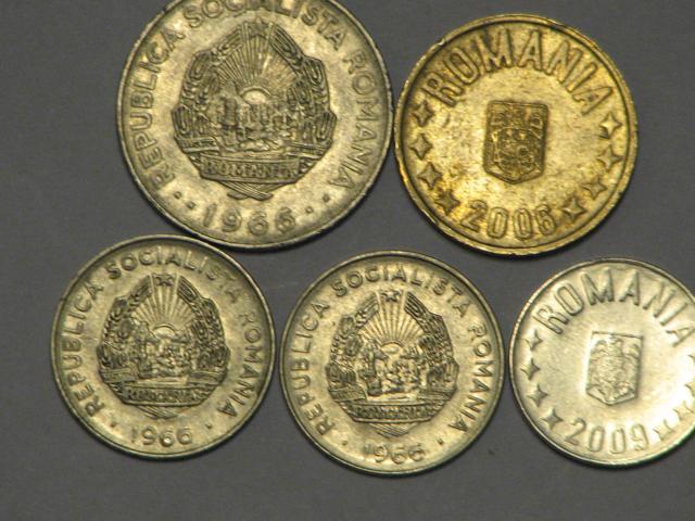 Rumunijos monetos: 50 bani; 25 bani ir 10 bani. 3 Lei ir viena iš 25 bani išmainytos