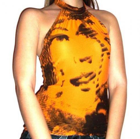 labai grazi , ryski spalva, susirisa per kakla todel nugara atvira iki puses, su juodu veido siluetu, puikus rubelis karsta vasaros diena ;)