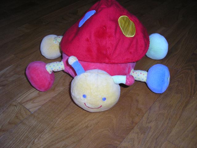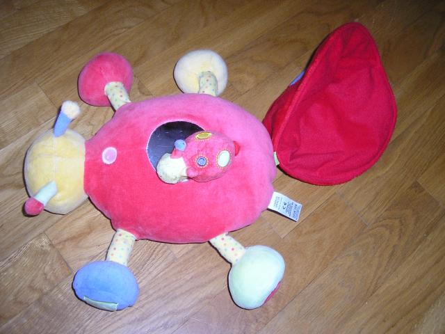 Ryski Marks&Spencer boruzele. Virsutine dalis visa ceza, paspaudus kojyte, atitinkamai sako angliskai: apskritimas, trikampis, kvadratas. Veikia trys kojytes, viena kojyte nekalba ir negroja. Paspaudus nugaryte netoli kakliuko cipsi. Ant nugaros yra vaikiskas veidrodelis, prie jo boruzes vaikelis :) kuri traukiant traska, o poto virvele dreba(vibruoja) ir susitraukia (grizta i pradine padeti).Bukle labai gera, nurodziau gera, kadangi neveikia viena kojyte.