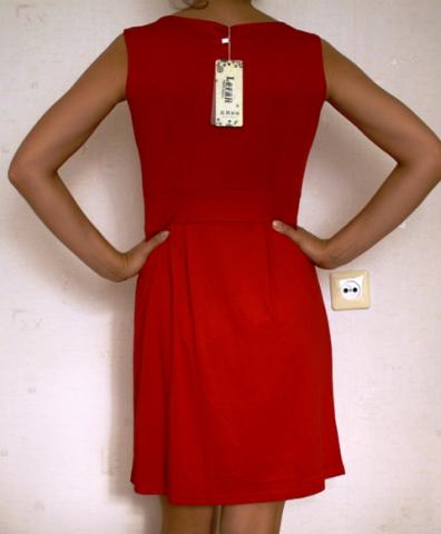 Nauja suknelė, puikiai priglundanti, įliemėnuota. Tamsesnės raudonos spalvos, audinys malonus prie kūnos, slidus.