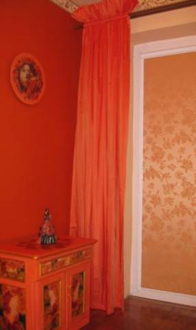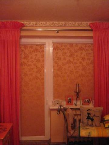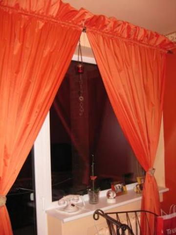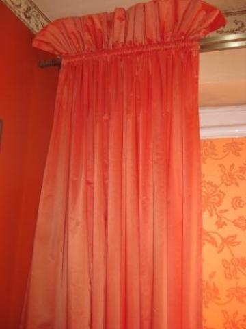 Ilgis nuo karnizo 2.50 m, plotis 1.95 m, "karūnos" aukštis 16-17 cm. Siūtos užuolaidų salone.