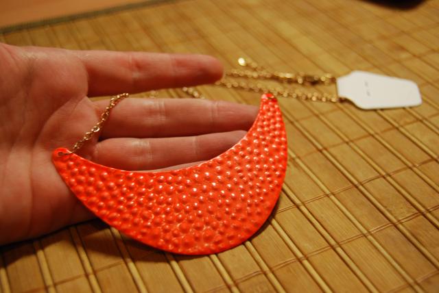 Ryškiai oranžinės spalvos kaklo papuošalas su aukso spalvos grandinėle. Ilgis reguliuojasi.