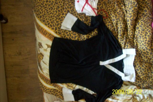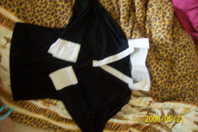 juoda, su balta apykakle ir rankogaliais ;) miela,nesiota,bet gerai islaikyta :)