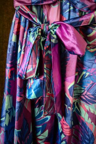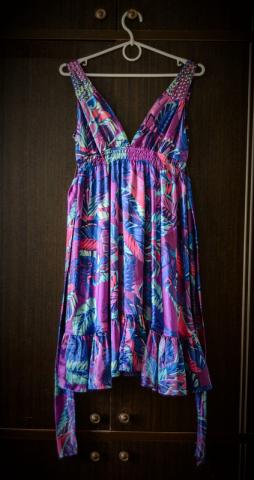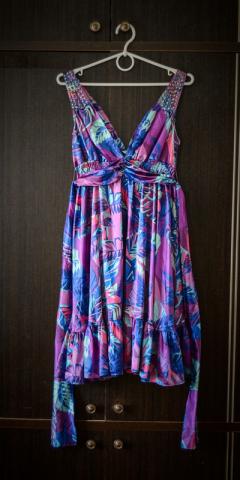 Parduodama nauja lengvos, plonos medžiagos suknelė. Medžiaga maloni, plėvesuojanti. Petnešėlės dekoruotos kniedėmis, priekyje ant liemens prisiūta juosta - galima surišti kaspiną priekyje arba nugaroje. Visas ilgis - 81 cm; Krūtinė - 38x2 cm; Liemuo - guma, 30x2 cm ramybės būsenoje, bet dar nemažai tempiasi. Nuo liemens laisvai krenta.
