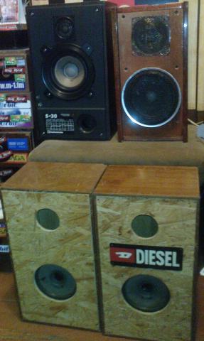 1. radiotehnika s30 / 10ac-315, atrodo, buvo ardyta, taciau viskas veikia, groja sodriai. 2. nezinau modelio, bet rusiska, sukasi galvoje kazkas panasaus i vega, lira ar arfa, nepamenu. viduje ant garsiakalbio parasyti metai 1984. vidus ir likusi skiaute ant galines puses - matyti nuotraukose. priekis neoriginalus arba nuluptas, priedo yra du skydeliai, manau nuo sitos koloneles. grojant siek tiek barska. 3-4. dezes vokiskos originalios, tik priekiai savadarbiai, garsiakalbiai automobiliniai, groja nega