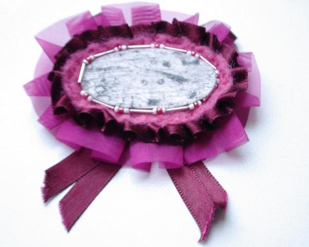 Nauja, rankų darbo, vienetinė, pagrindas iš veltinio, dekoruota karoliukais ir šilku, viduryje - dekupažas, kur ilgiau pažiūėję įžvelgsite katinuką su skrybelaite! ( Realybėje sagės spalva truputį sodresnė).