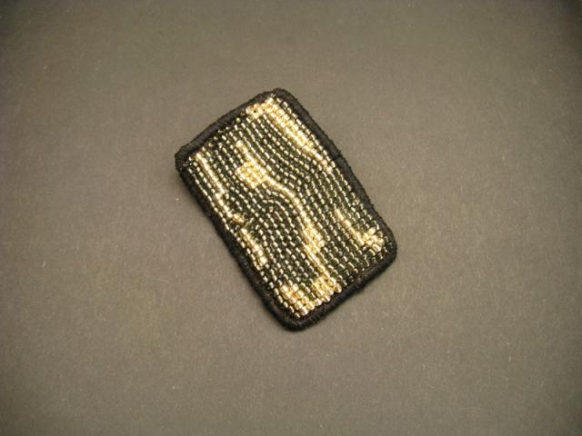Siuvinėta karoliukais sagė, su užsegimu. Matmenys 6,0 cm x 4,0 cm