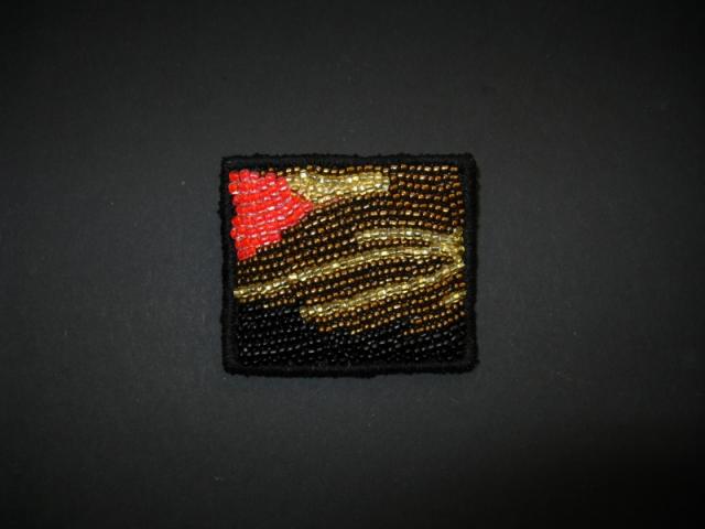 Rankų darbo sagė, siuvinėta stikliniais karoliukais, su užsegimu. Matmenys 5,0 cm x 6,0 cm