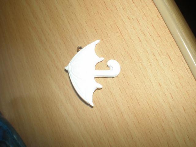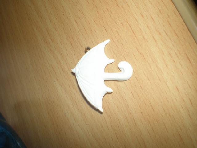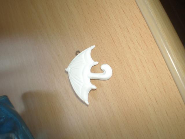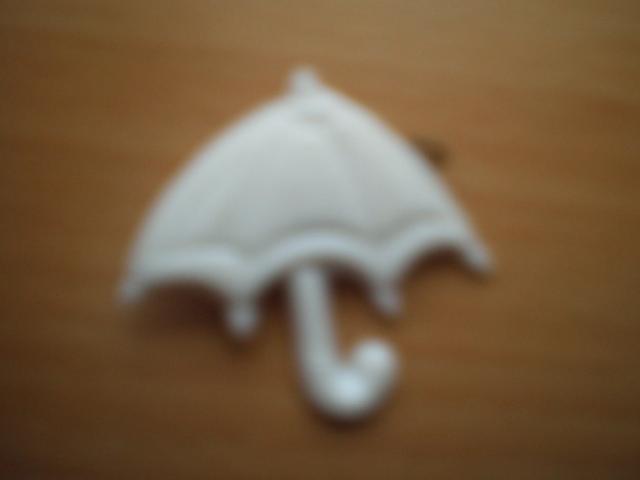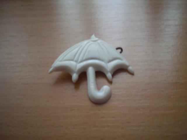 Baltas skėtis. Nedidelis. Galima prisisegti prie maikutės, kelnių ir pan. :)