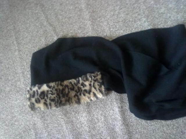 Gražus, juodas šalikas-gobtuvas, ilgais skvernais, gobtuvas puoštas leopardo rašto imituotu kailiu. Labai šiltas ir jaukus. Firma- Monkey Clothing