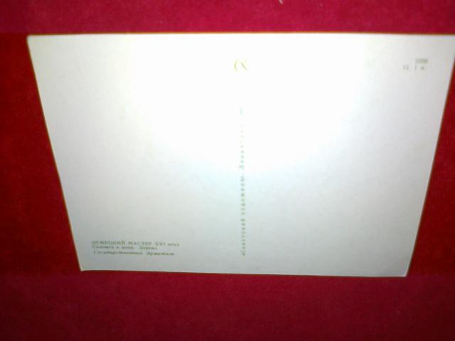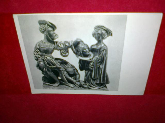 Salomėja ir karys. Medis. Vokiečių meistras XVI a. Skulptūra saugoma Ermitaže. Atvirukas 1965 metų.