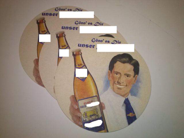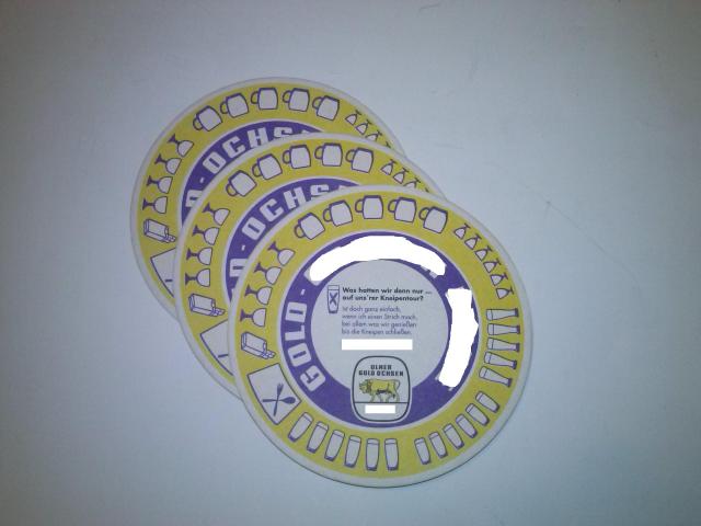 1. Vokiško salyklinio gėrimo padėkliukai "Gold Ochsen xxxx" - iš abiejų pusių skirtingas paveiksliukas - 1 ir 2 foto - yra 3 vnt. po 0,30eur/vnt. 2. Vokiško salyklinio gėrimo padėkliukai "Hacker pschorr" - iš abiejų pusių paveiksliukas vienodas - 3 foto - yra 6 vnt. po 0,33eur/vnt. 3. Verygenbourg 1664 - 4-5 foto - yra 1vnt., 0,33eur/vnt. Gal čia visur reklamuojama gira???
