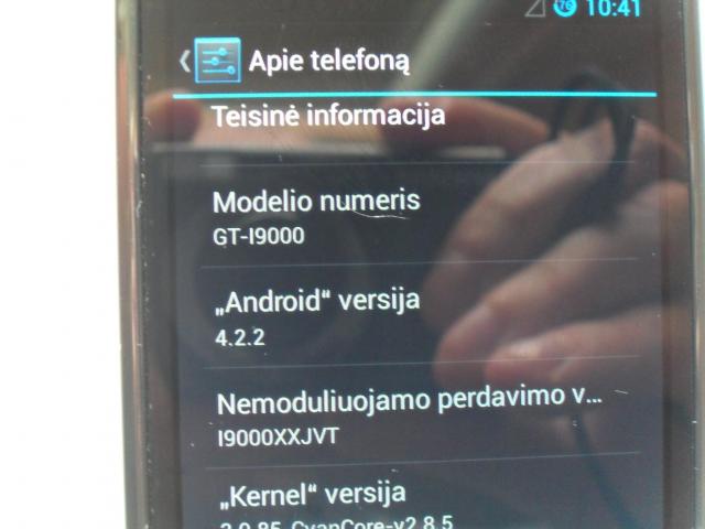 Samsung Galaxy S1 I9000 8GB vidinė atmintis su Android OS 4.2.2 Super AMOLED 4 colių (capactive) Gorilla Glass atspariu įbrėžimams ekranas (su plėvele), kurio raiška 480 x 800. Turi 5 MP vaizdo kamerą su automatinio fokusavimo galimybe, GPS imtuvą, „Wi-Fi” ir Bluetooth 3.0 bevielio ryšio modulius, 512 MB RAM, 2GB ROM. Komplekte pakrovėjas, USB laidas. Lietuviškas meniu. Kaina galutinė 300 lt.