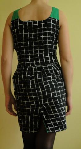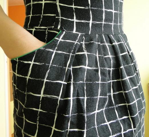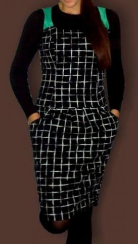 sarafanas su kišenėmis, petnešos, kišenės kraštelis bei skeltuko kraštas žali